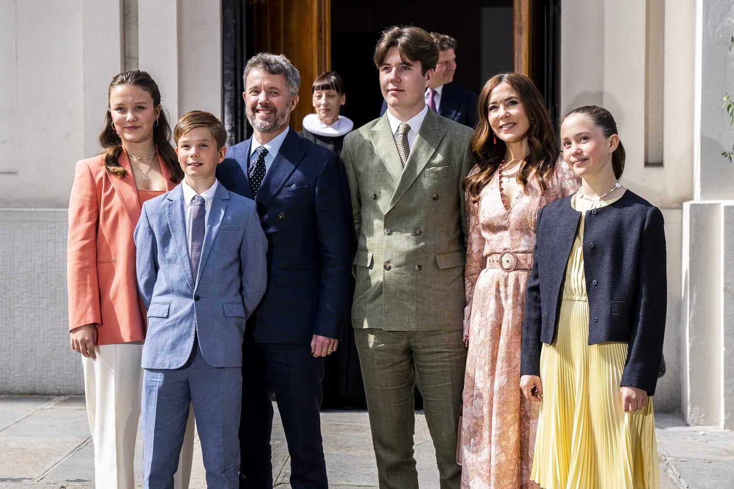 Prinses Isabella (16) lijkt in lengte inmiddels haar moeder voorbij. Ze droeg voor de gelegenheid de perzikkleurige Scanlan Theodore blazer van haar moeder. Ook prinses Josephine (12) had in Mary’s inloopkast ‘gewinkeld’ en daar een gele Pradajurk met plissés gevonden.
