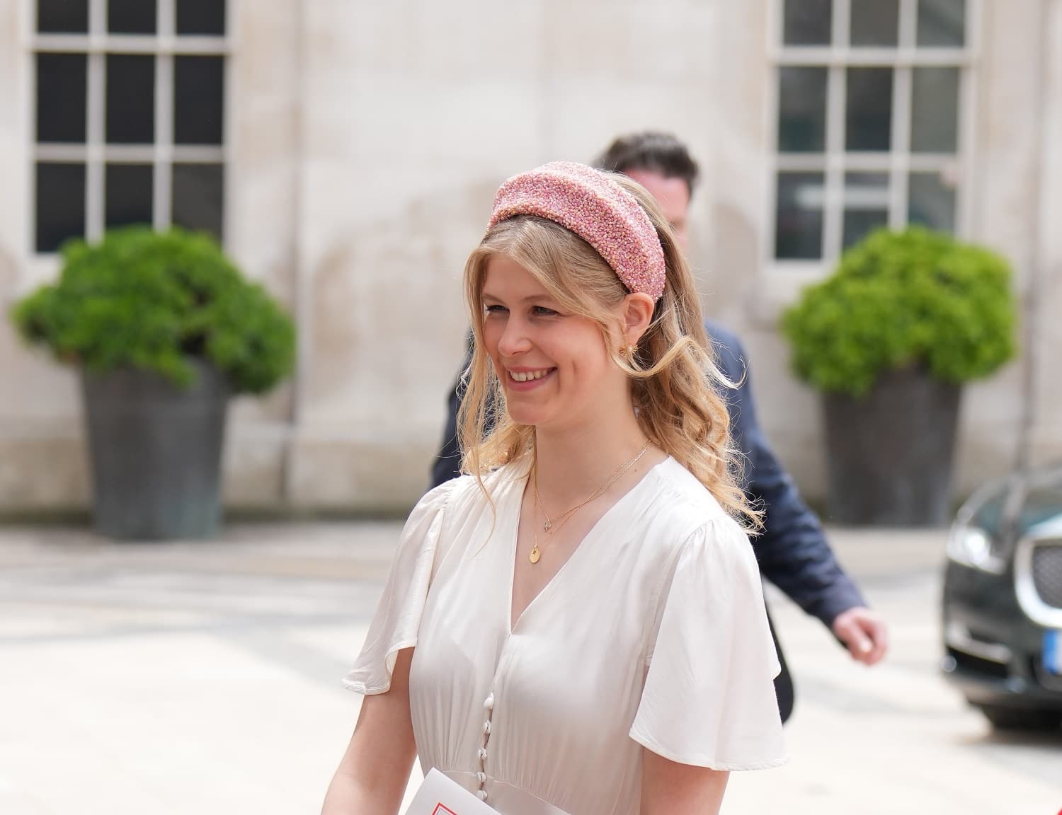 Voor de dankdienst die in St Paul’s Cathedral werd gehouden voor haar oma droeg Louise de Delphine jurk van Ghost London en een chunky roze haarband van Jane Taylor. Not loving de losse uitgeföhnde plukken die de look een beetje sloom maken; de stevige hakken en de Sophie Habsburg Chenille clutch compenseren dat niet helemaal.