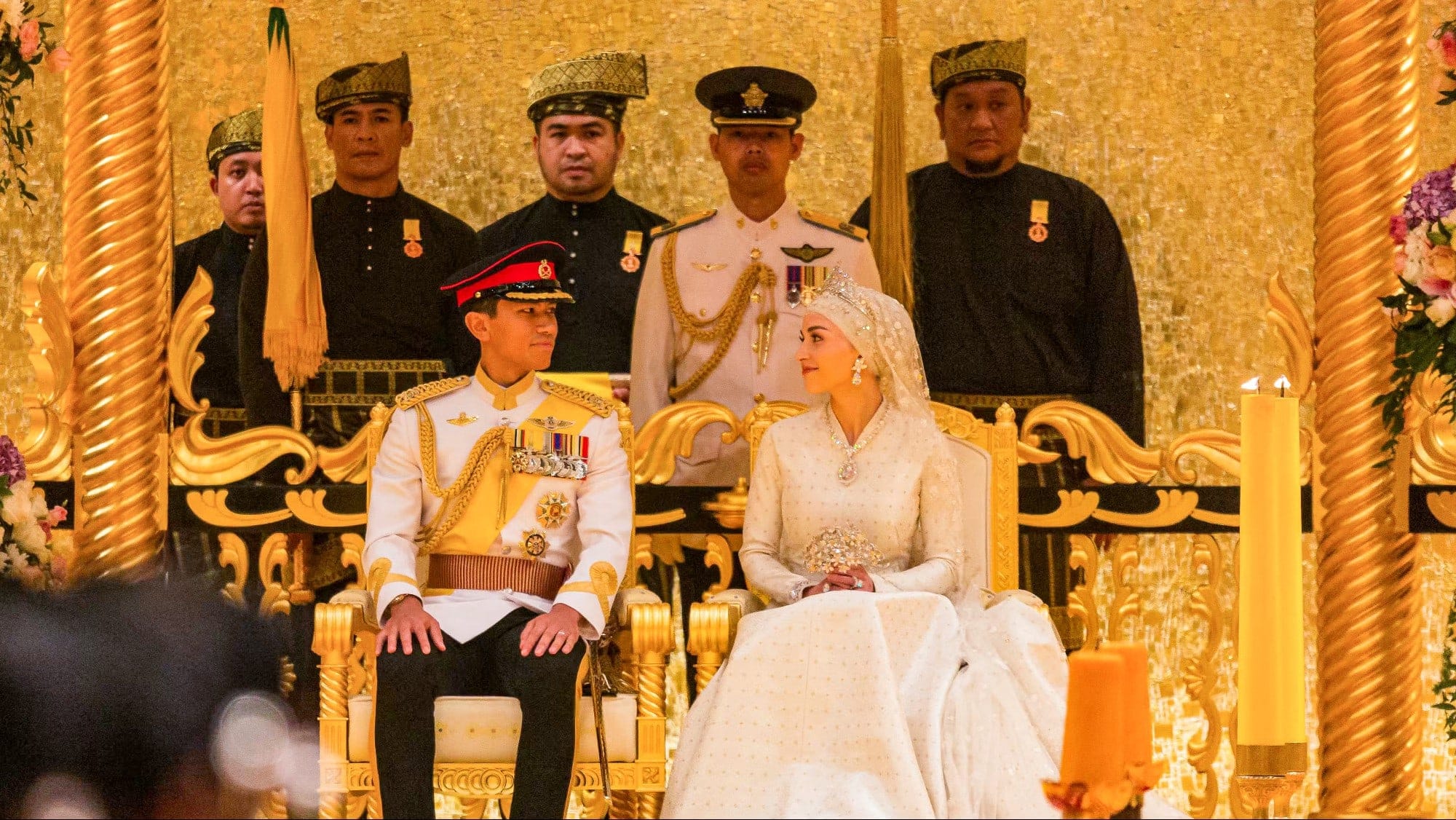 Prince Abdul Mateen and Yang Mulia Anisha Rosnah sit during their wedding reception at Istana Nurul Iman in Brunei's capital Bandar Seri Begawan on January 14, 2024. Iqbal Dato Hj Selamat / AFP
